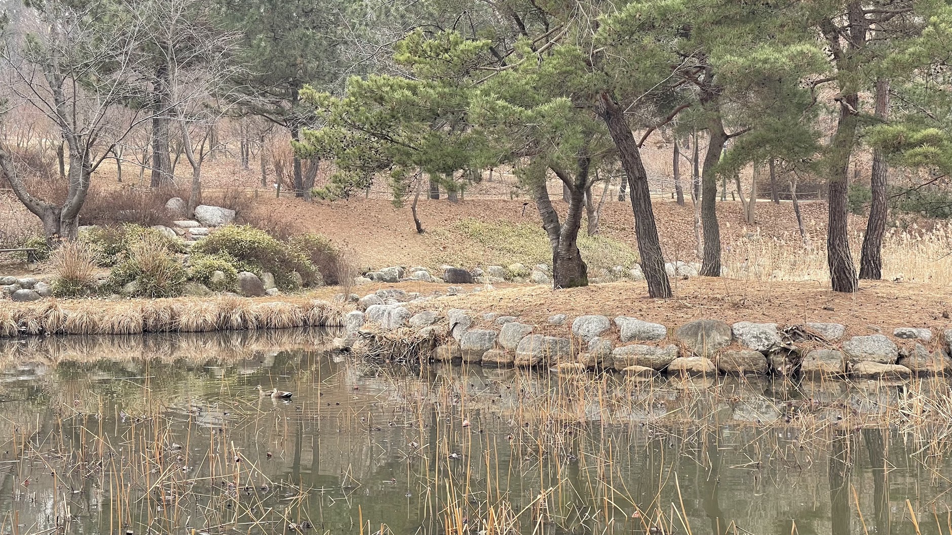 수련, 부들, 개구리밥 등 여러가지 수생식물들이 자라고 있는데, 오리들도 꽤 많이 살고 있어요.
