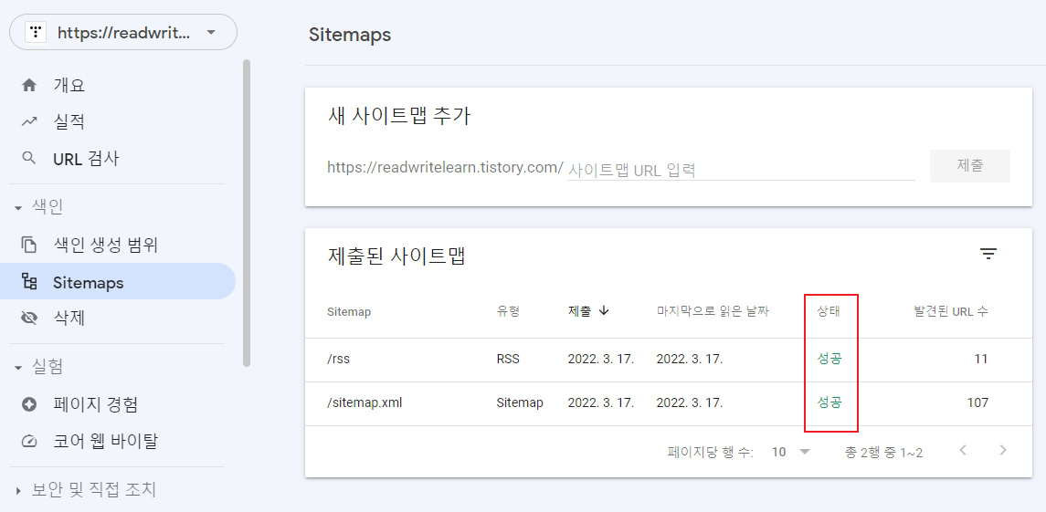 사이트맵과 RSS를 성공적으로 제출하고 나면, 해당 창의 상태 항목이 '성공'으로 표시됩니다.