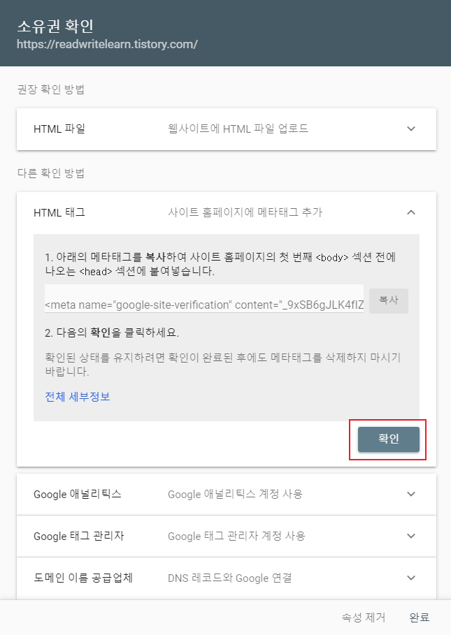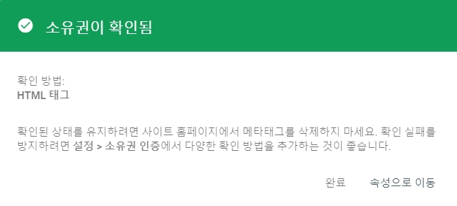 메타태그 저장 후 '소유권 확인' 창으로 돌아와 '확인' 버튼을 누르면 아래와 같이 '소유권이 확인됨' 결과 창이 나타납니다.