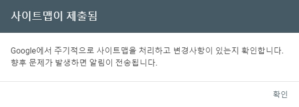 '사이트맵이 제출됨'이라는 결과 창이 나옵니다. '확인' 버튼을 누릅니다.