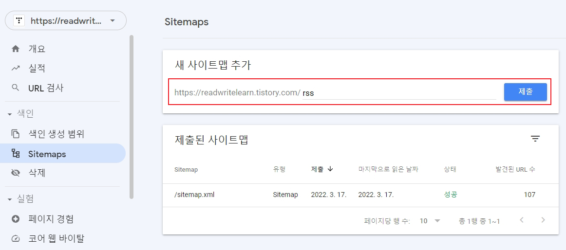 구글 서치 콘솔 화면의 왼쪽 메뉴에서 Sitemaps 메뉴를 선택하여 사이트맵과 RSS를 추가합니다.