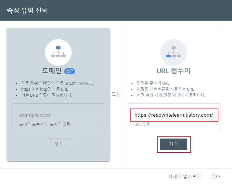 이 중 'URL 접두어'를 선택하고 자신의 티스토리 URL을 입력한 후 '계속' 버튼을 누릅니다.