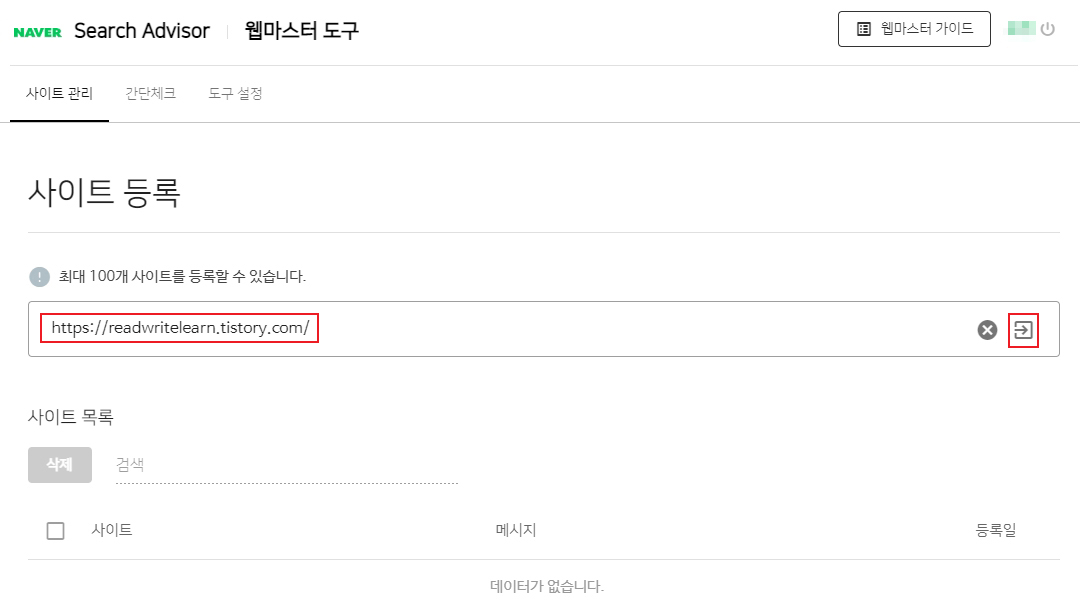 입력창에 등록하려는 사이트의 url을 입력하고 검색 버튼을 누릅니다.
