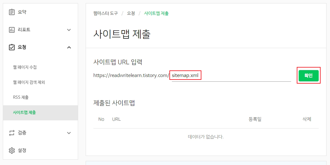 사이트맵 URL 입력창에 'sitemap.xml'을 입력하고 '확인' 버튼을 누릅니다.