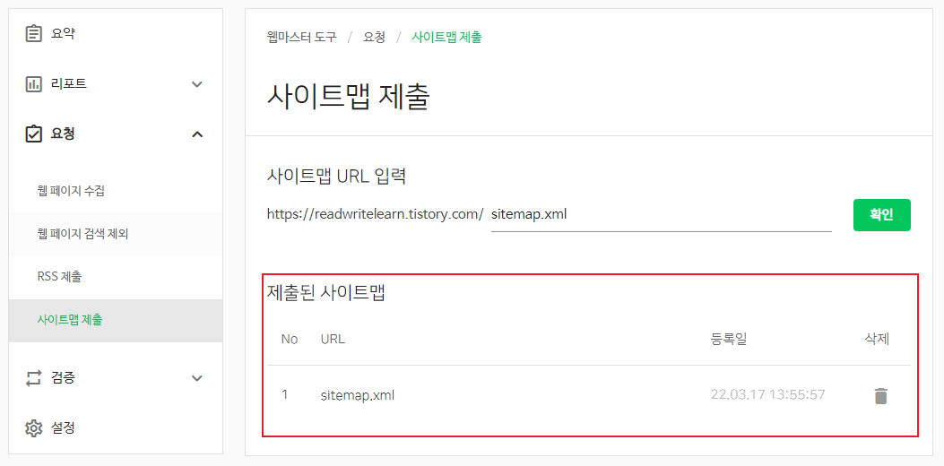 보안절차를 거치면 '제출된 RSS 제출' 목록에 등록한 rss 주소를 확인할 수 있습니다.