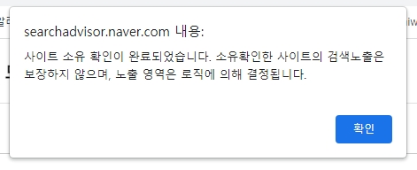 메타태그 저장 후 '사이트 소유 확인' 창으로 돌아와 '소유확인' 버튼을 누르고 보안절차를 걸치면 아래와 같이 소유 확인 결과 창이 나타납니다.