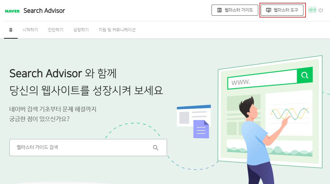 우측 상단의 '웹마스터 도구' 버튼을 클릭합니다.