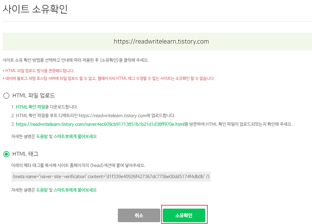 사이트 소유 확인 페이지가 나오면 'HTML 파일 업로드'와 'HTML 태그' 항목 중 아래에 있는 'HTML 태그' 항목을 선택합니다. 아래에 출력되는 메타 태그를 복사합니다.