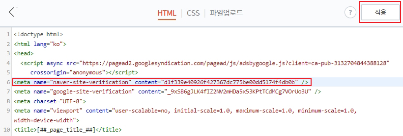 HTML 편집 화면이 나타나면 위에서 복사한 메타태그를 <head>섹션에 붙여 넣고 '적용' 버튼을 눌러 저장시킵니다.