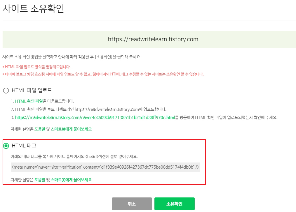 사이트 소유 확인 페이지가 나오면 'HTML 파일 업로드'와 'HTML 태그' 항목 중 아래에 있는 'HTML 태그' 항목을 선택합니다. 아래에 출력되는 메타 태그를 복사합니다.
