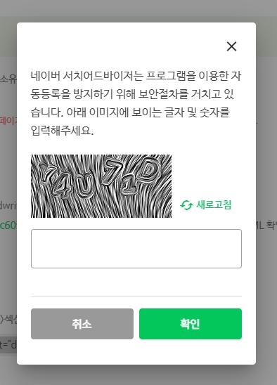 메타태그 저장 후 '사이트 소유 확인' 창으로 돌아와 '소유확인' 버튼을 누르고 보안절차를 걸치면 아래와 같이 소유 확인 결과 창이 나타납니다.