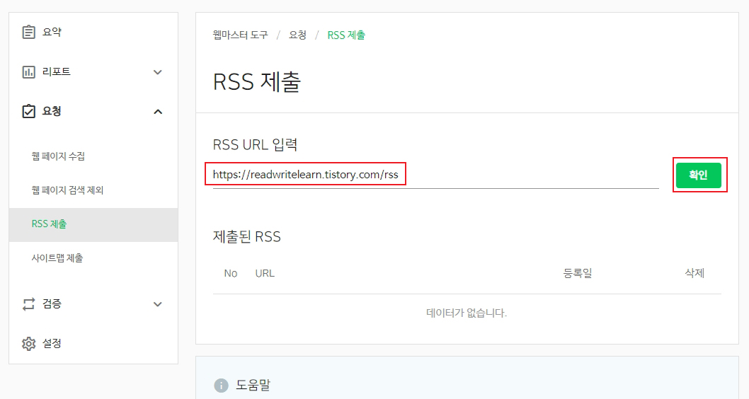 해당 사이트의 관리 페이지가 열리고 왼쪽에 메뉴가 나타납니다. 메뉴 중 요청 > RSS제출 항목을 선택합니다.