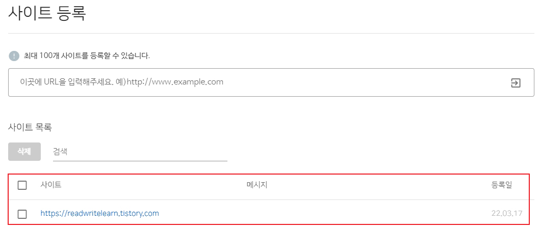 사이트 등록 페이지 하단의 '사이트 목록'에 등록한 사이트의 url이 출력되는 것을 확인할 수 있습니다.