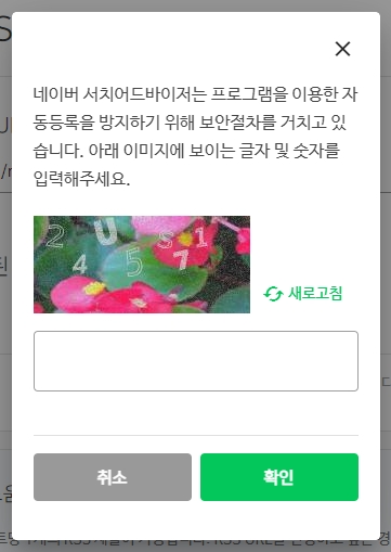 'RSS URL 입력'란에 '티스토리 주소/rss'를 입력하고 '확인' 버튼을 누릅니다.