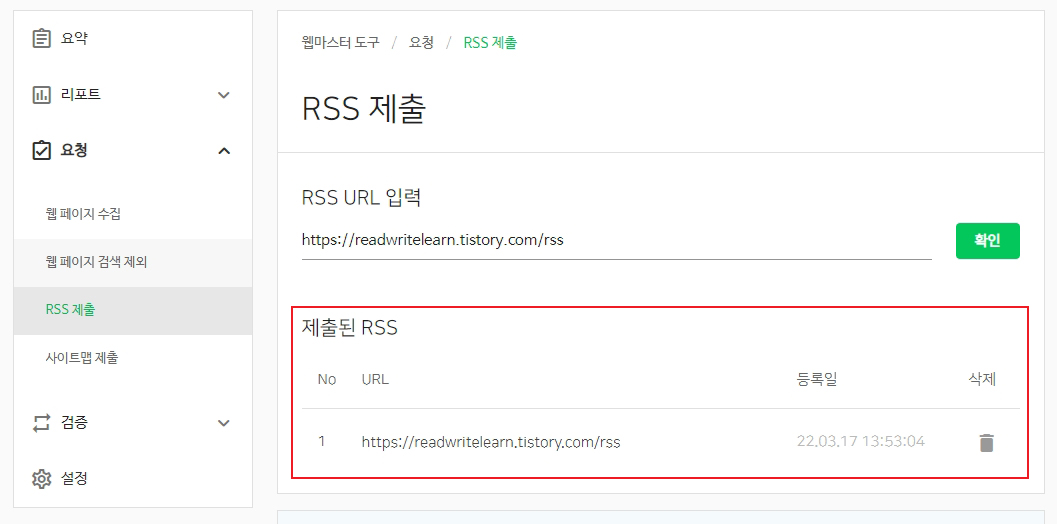 보안절차를 거치면 '제출된 RSS 제출' 목록에 등록한 rss 주소를 확인할 수 있습니다.