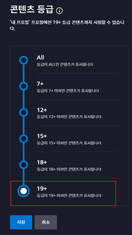 확인해보니 19+등급 콘텐츠까지 시청할 수 있도록 설정되어 있는것이 맞았습니다.