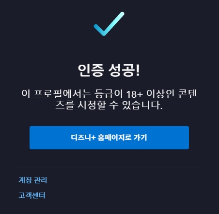 그런데 어른용 디즈니 플러스 계정에 분명 19+등급 콘텐츠까지 시청할 수 있게 설정을 해 놓았는데도 성인인증이 필요하다는 메시지와 함께 컨텐츠 재생이 되지 않았습니다.