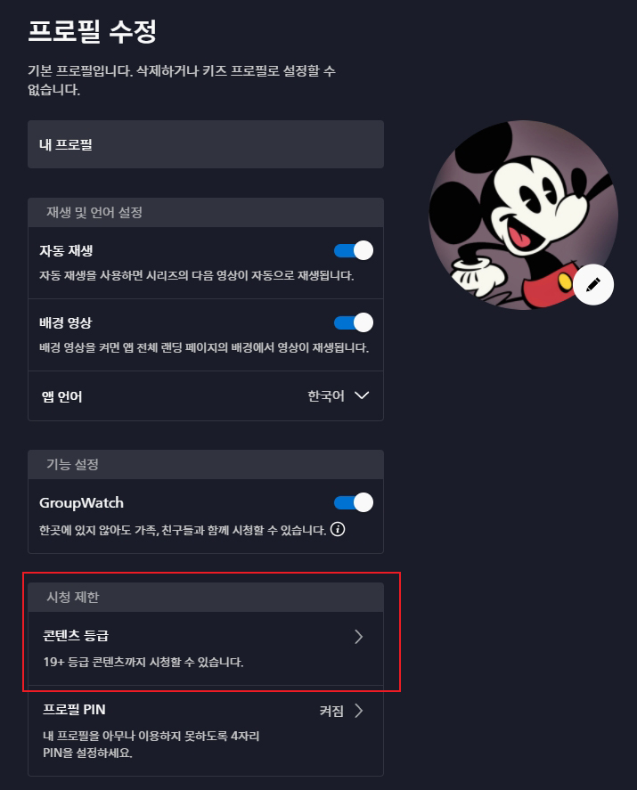 4. 프로필 수정 페이지에서 '시청제한 > 콘텐츠 등급'을 선택합니다.