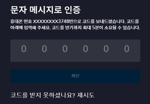 5. 문자메시지를 확인하여 전송받은 '6자리 코드'를 화면에 입력한 후, '확인' 버튼을 누릅니다.