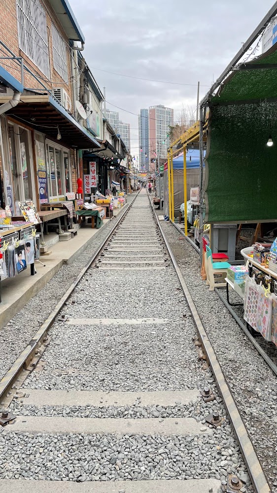 철길에 서서 보면 이런 모습입니다. 철길 양쪽으로 상점들이 줄지어 있습니다.