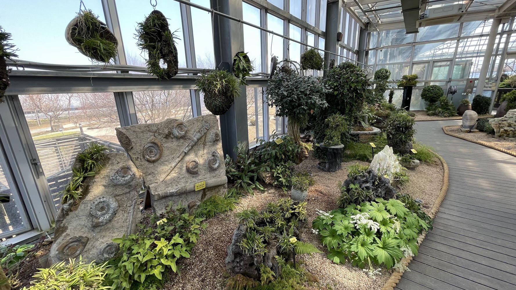 입구 건물엔 전시관들이 몇 개 있고, 가운데 보이는 계단으로 올라가면 뒤쪽에 있는 유리 온실로 이어집니다.