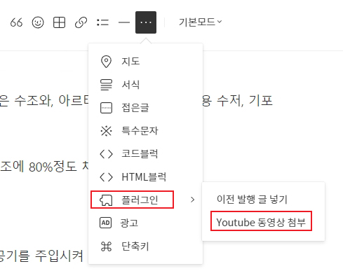 '더보기'를 클릭하여 하위 메뉴의 '플러그인', 다시 그 하위 메뉴인 'Youtube 동영상 첨부'를 차례로 클릭합니다.