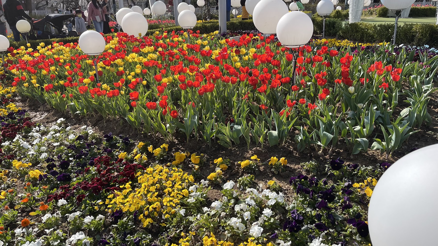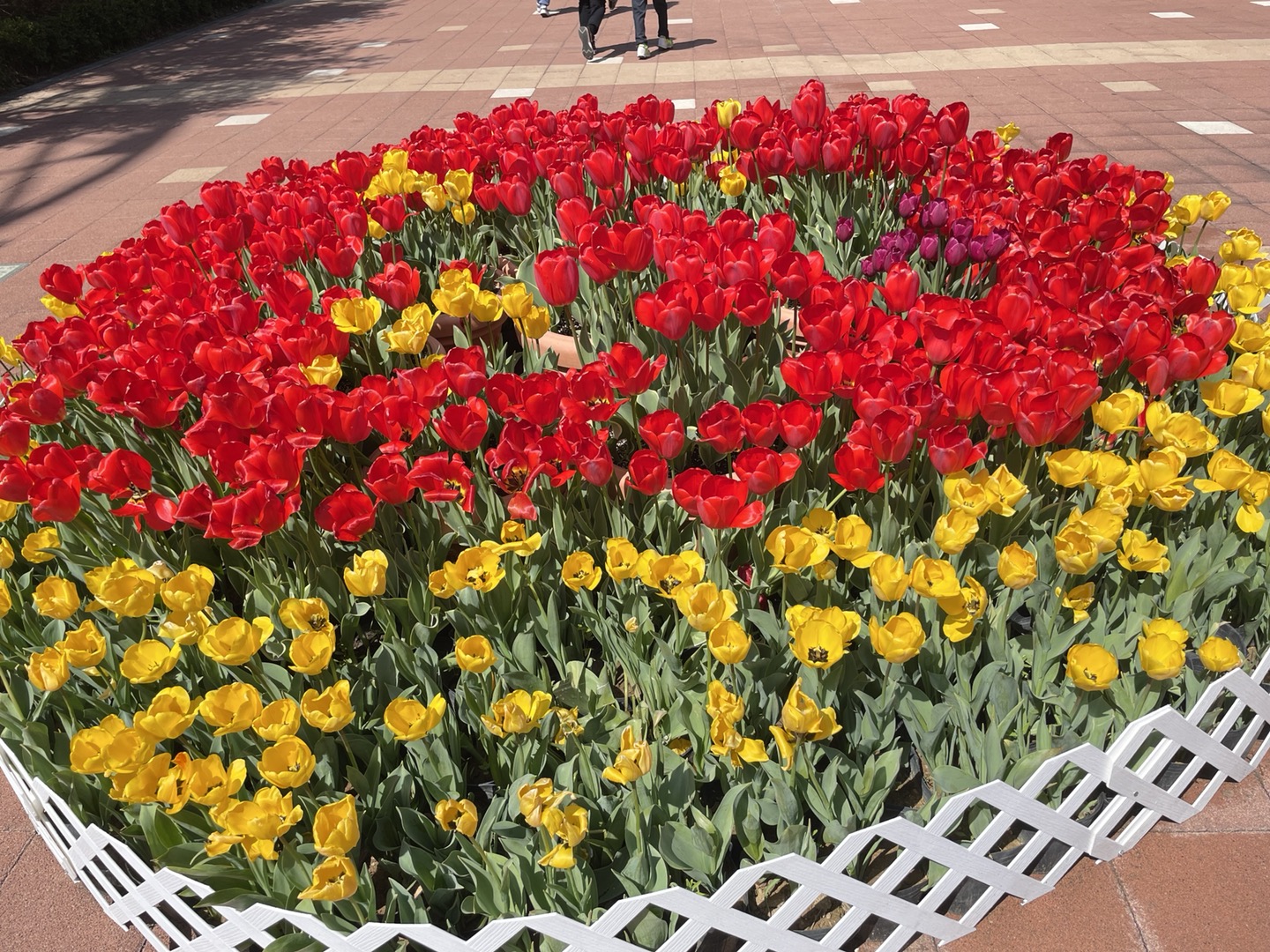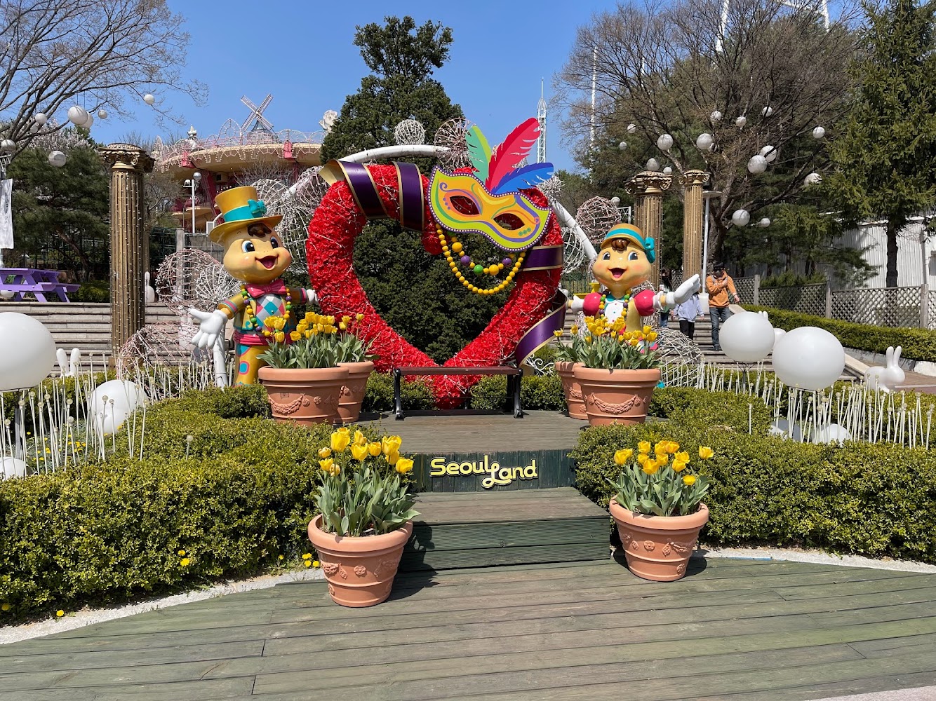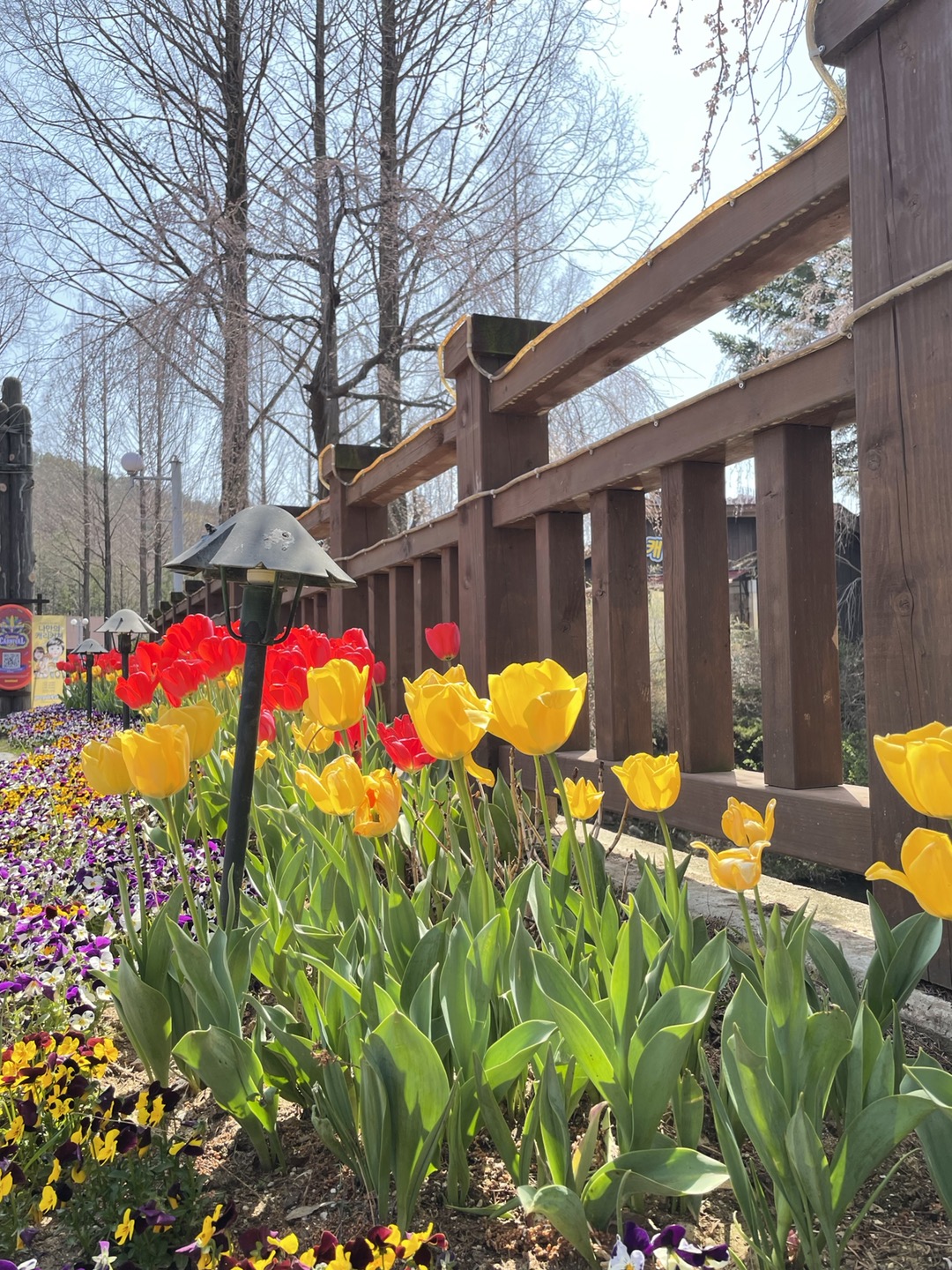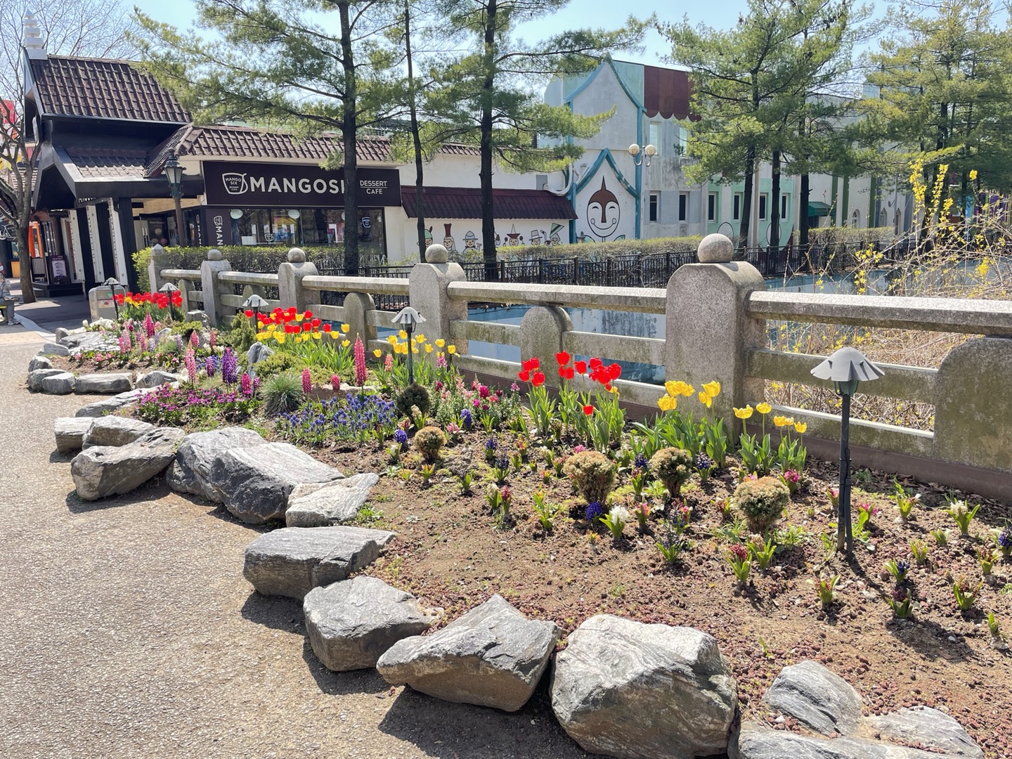 놀이공원 곳곳이 노랗고 빨간 튤립들로 장식되어 있습니다.