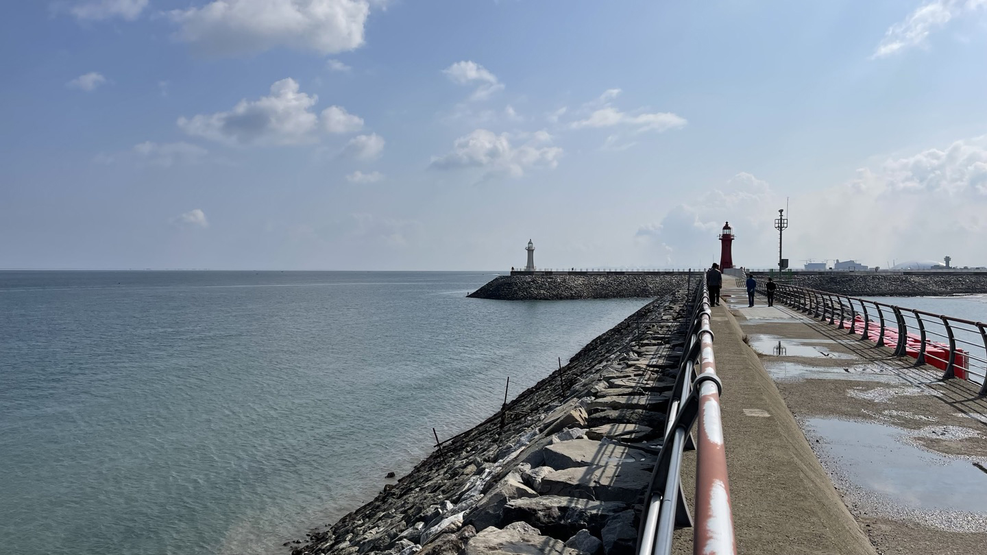 멀리 등대 2개가 쌍둥이처럼 서 있습니다. 방파제 한 가운데는 막혀 있지 않아 그 사이로 배가 들어왔다 나갔다 합니다.